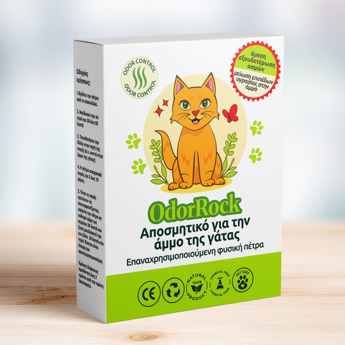 Το OdorRock είναι μια επαναχρησιμοποιούμενη φυσική πέτρα, ένα οικολογικό μη-καρκινογόνο προϊόν, που εξαλείφει τις δυσάρεστες οσμές, τα βακτήρια και την υγρασία και αποτρέπει την επανεμφάνισή τους. Ρυθμίζει φυσικά τα επίπεδα της υγρασίας και είναι απαλλαγμένο από επιβλαβείς χημικές ουσίες και βαρέα μέταλλα. Μπορεί να διαμορφωθεί και να προσαρμοστεί ανάλογα με την προβλεπόμενη χρήση του. Χάρη στη σύνθεσή της, μπορεί να χρησιμοποιείται για έως 2 χρόνια.