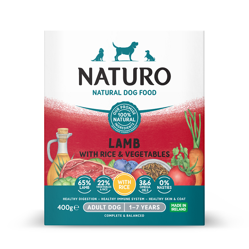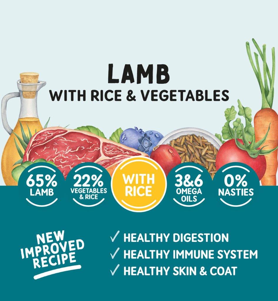 Πλήρης και ισορροπημένη νωπή τροφή για σκύλους με αρνί, ρύζι και λαχανικά.