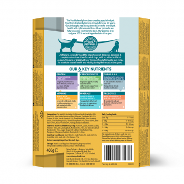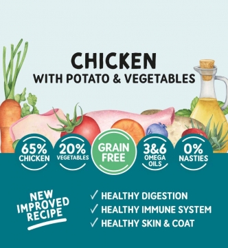 Πλήρης και ισορροπημένη νωπή τροφή για σκύλους με κοτόπουλο, πατάτα και λαχανικά.