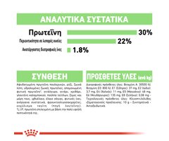 Συνθεση: κρέατα και υποπροϊόντα ζώων, υποπροϊόντα φυτικής προελεύσεως, σιτηρά, έλαια και λίπη, ανόργανα συστατικά, σάκχαρα.