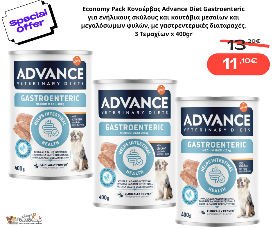 Economy Pack Κονσέρβας Advance Diet Gastroenteric για ενήλικους σκύλους και κουτάβια μεσαίων και μεγαλόσωμων φυλών, με γαστρεντερικές διαταραχές, 3 Τεμαχίων x 400gr