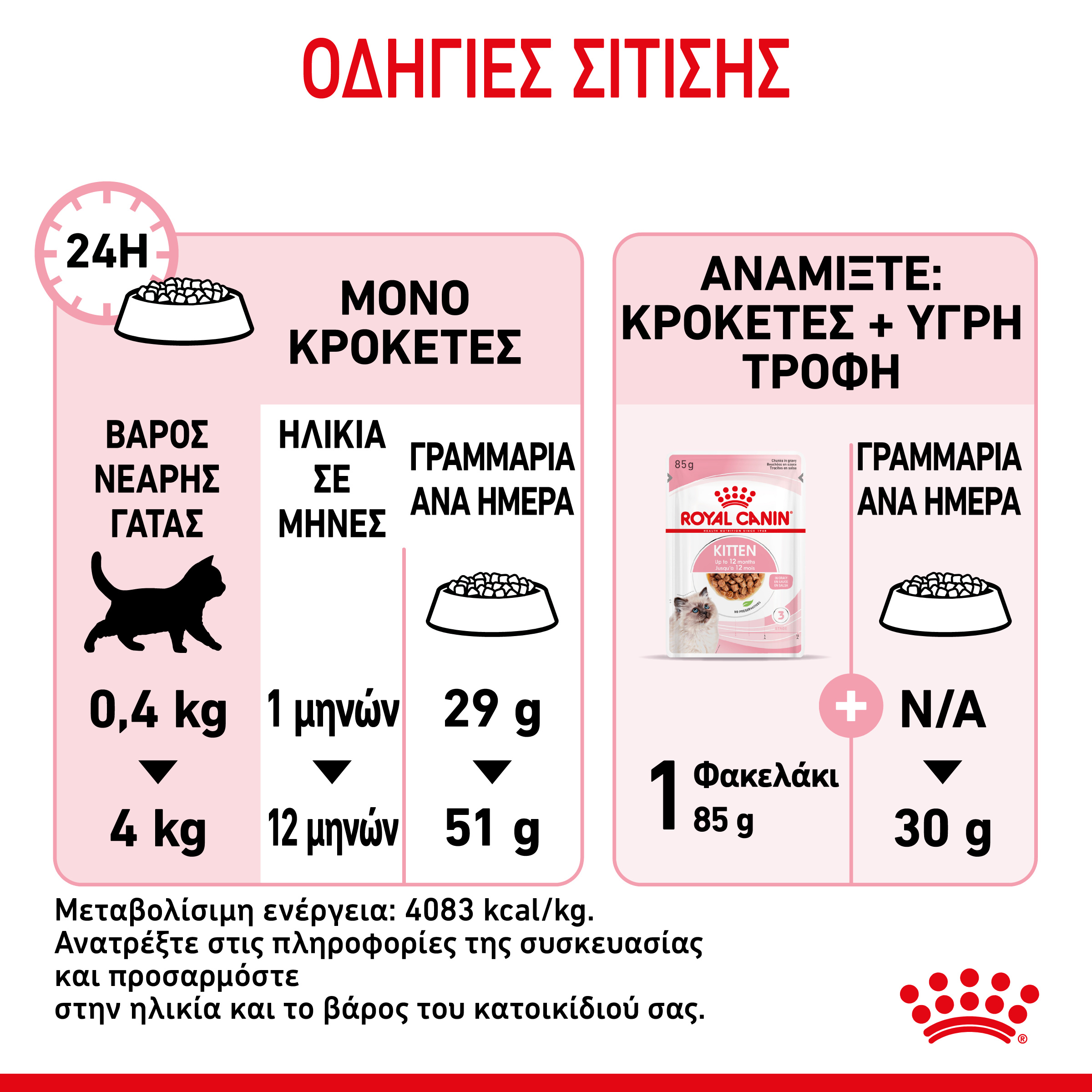 Για να ικανοποιήσει τις προτιμήσεις κάθε γάτας, το ROYAL CANIN® Kitten είναι επίσης διαθέσιμο ως βρεγμένο φαγητό σε νόστιμο σάλτσα ή ζουμερό ζελέ.