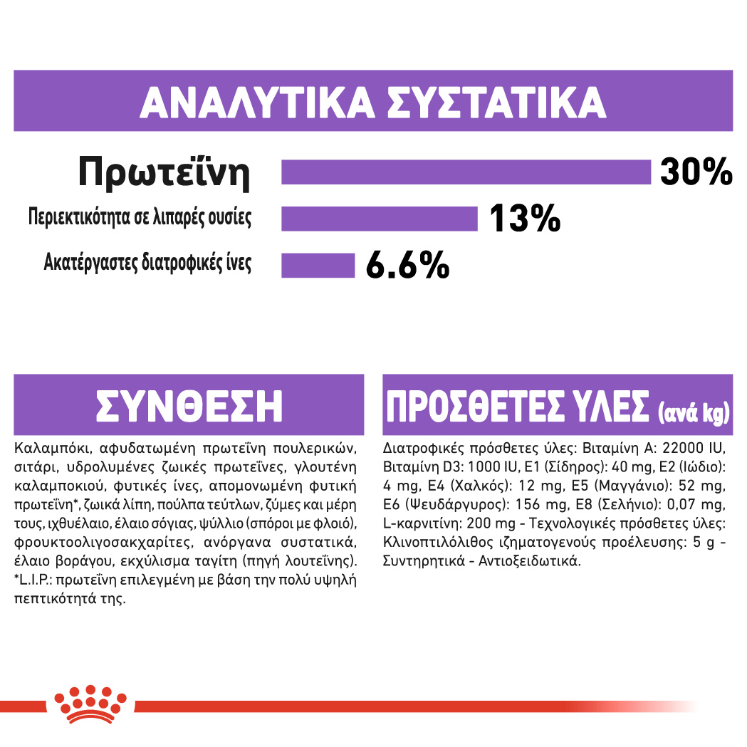 Η συνταγή του Sterilized Mini είναι πλούσια σε εξαιρετικά εύπεπτες πρωτεΐνες, για να βεβαιωθείτε ότι ο σκύλος σας διατηρεί τη μυϊκή μάζα μειώνοντας ταυτόχρονα την πρόσληψη λίπους και θερμίδων.