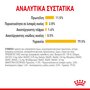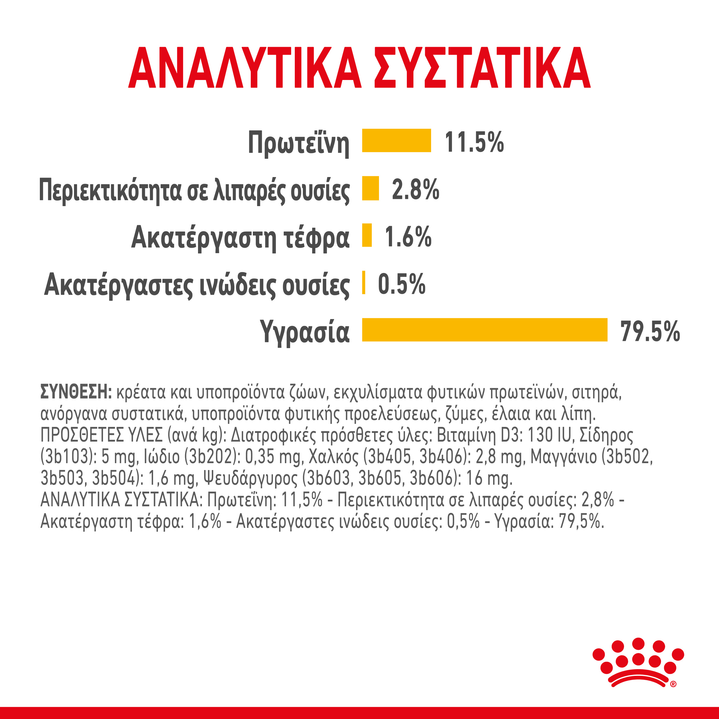 | ΣΥΝΘΕΣΗ: κρέατα και υποπροϊόντα ζώων, εκχυλίσματα φυτικών πρωτεϊνών, ανόργανα συστατικά, υποπροϊόντα φυτικής προελεύσεως, ζύμες, σάκχαρα. ΠΡΟΣΘΕΤΕΣ ΥΛΕΣ (ανά kg): Διατροφικές πρόσθετες ύλες: Βιταμίνη D3: 100 IU, Σίδηρος (3b103): 5 mg, Ιώδιο (3b202): 0,26 mg, Χαλκός (3b405, 3b406): 2,1 mg, Μαγγάνιο (3b502, 3b503, 3b504): 1,6 mg, Ψευδάργυρος (3b603, 3b605, 3b606): 16 mg. ΑΝΑΛΥΤΙΚΑ ΣΥΣΤΑΤΙΚΑ: Πρωτεΐνη: 11,0% - Περιεκτικότητα σε λιπαρές ουσίες: 4,5% - Ακατέργαστη τέφρα: 1,8% - Ακατέργαστες ινώδεις ουσίες: 0,5% - Υγρασία: 80,2%. ΟΔΗΓΙΕΣ ΣΙΤΙΣΗΣ: βλέπε πίνακα δοσολογίας. Αριθμός παρτίδας, αριθμός εργοστασιακής καταχώρησης και ημερομηνία ελάχιστης διατηρησιμότητας: βλέπε στη συσκευασία. Διατηρείται σε μέρος δροσερό και ξηρό. |
