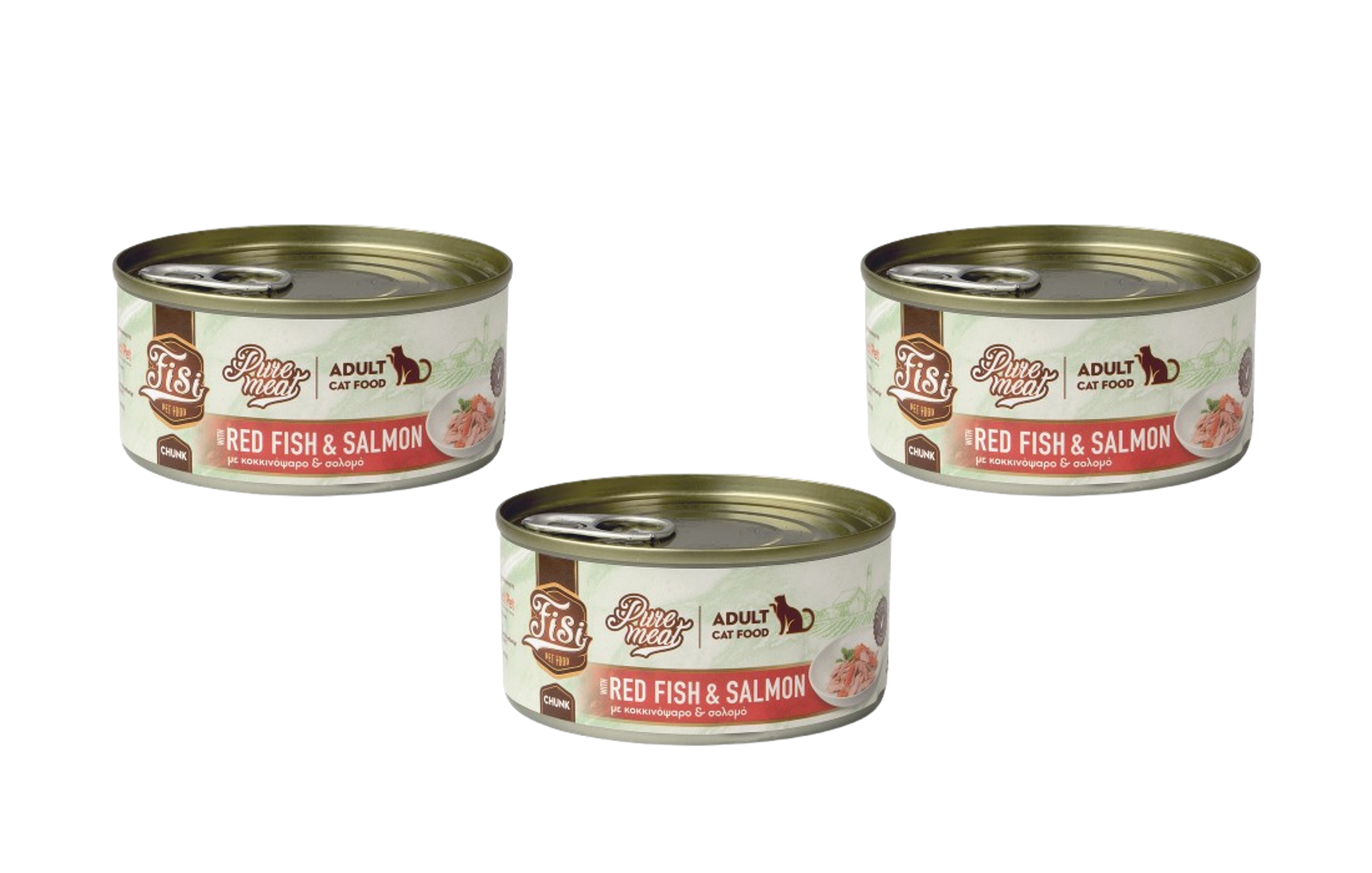 Υγρή διατροφή με κοκκινόψαρο και σολομό σε μπουκιές για ενήλικες γάτες.