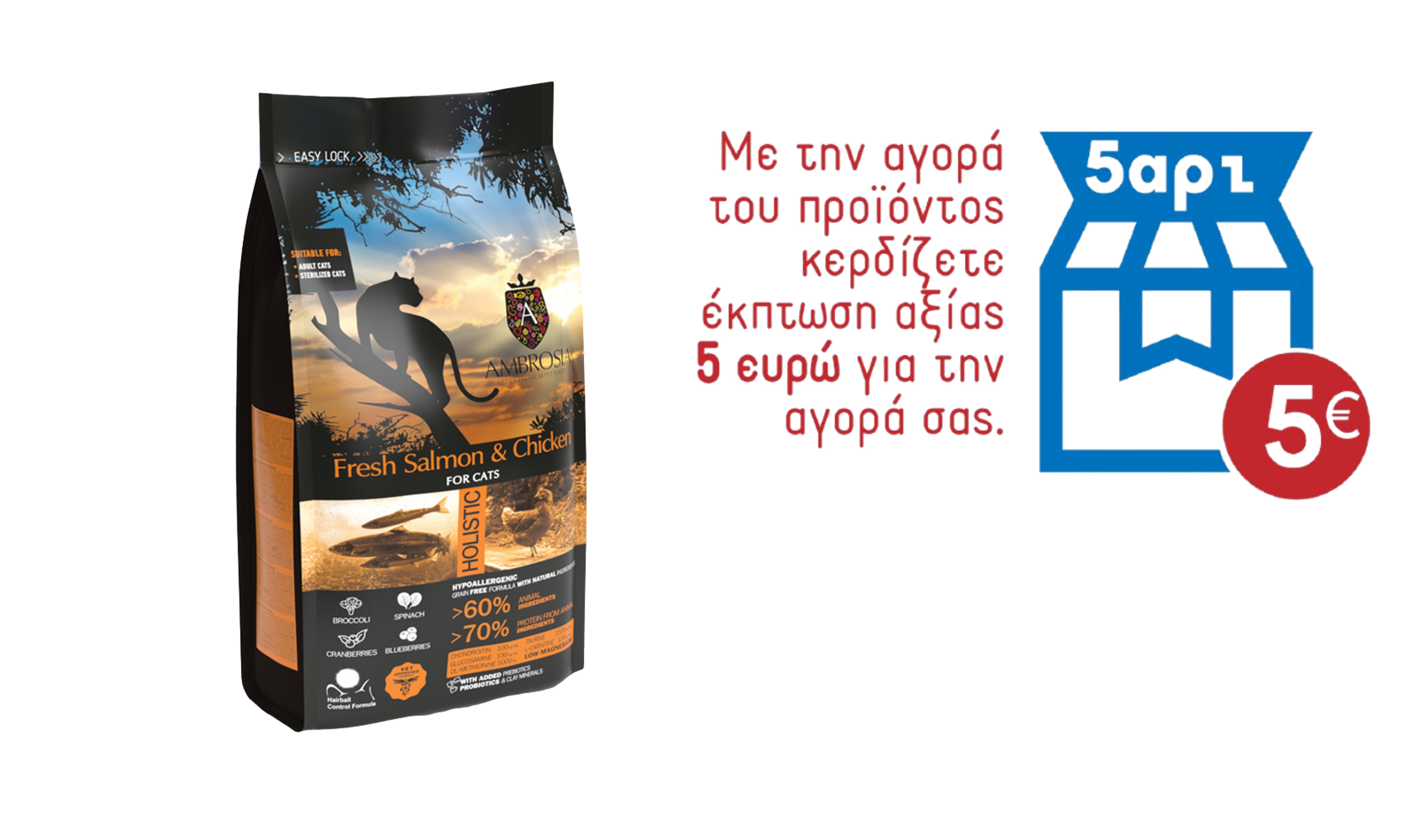 Η ξηρά τροφή Ambrosia Grain Free Adult Sterilised Cat Fresh Salmon & Chicken είναι μία ελληνική ultra premium τροφή για ενήλικες στειρωμένες γάτες.