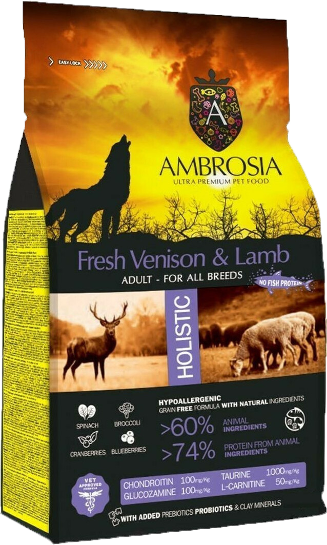 Η ξηρά τροφή Ambrosia Grain Free Adult Venison & Lamb είναι μία ελληνική ultra premium τροφή για ενήλικους σκύλους όλων των φυλών.