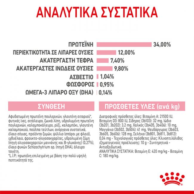 Η Sterilised Kitten περιέχει μέτριο επίπεδο σε λιπαρά για τον περιορισμό της αύξησης του βάρους, χωρίς συμβιβασμό σχετικά με την πρόσληψη πρωτεϊνών, ασβεστίου, φωσφόρου για μια υγιή ανάπτυξη.