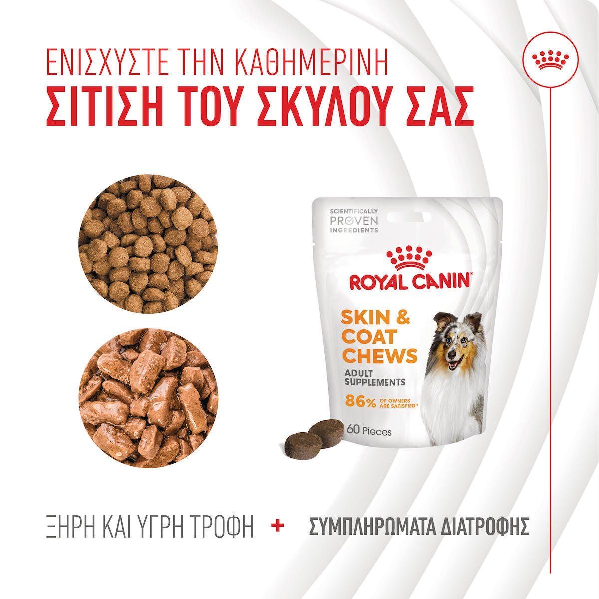 Κατάλληλα για ενήλικους σκύλους, τα μασώμενα συμπληρώματα Skin & Coat Adult της ROYAL CANIN® σχεδιάζονται από κτηνιάτρους και εγκρίνονται από τους ίδιους τους σκύλους.