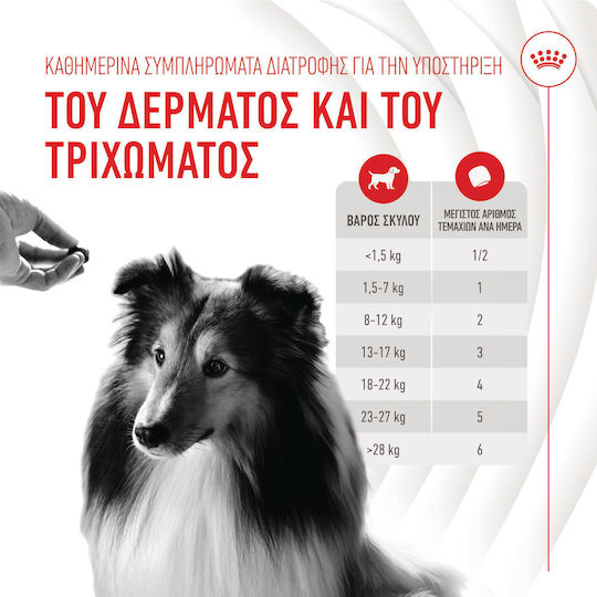 Τα μασώμενα συμπληρώματα Skin & Coat Adult της ROYAL CANIN® σχεδιάζονται για τη διατήρηση της υγείας του δέρματος και της λάμψης του τριχώματος. Περιέχουν ωμέγα-3 και ωμέγα-6 λιπαρά οξέα που θρέφουν το δέρμα και το τρίχωμα, μαζί με ψευδάργυρο και GLA για την υποστήριξη της λειτουργίας του επιδερμικού φραγμού. Επιπλέον, περιλαμβάνεται ένα μείγμα βιταμινών που προάγει τη φυσική και υγιή ανανέωση των κυττάρων του δέρματος.