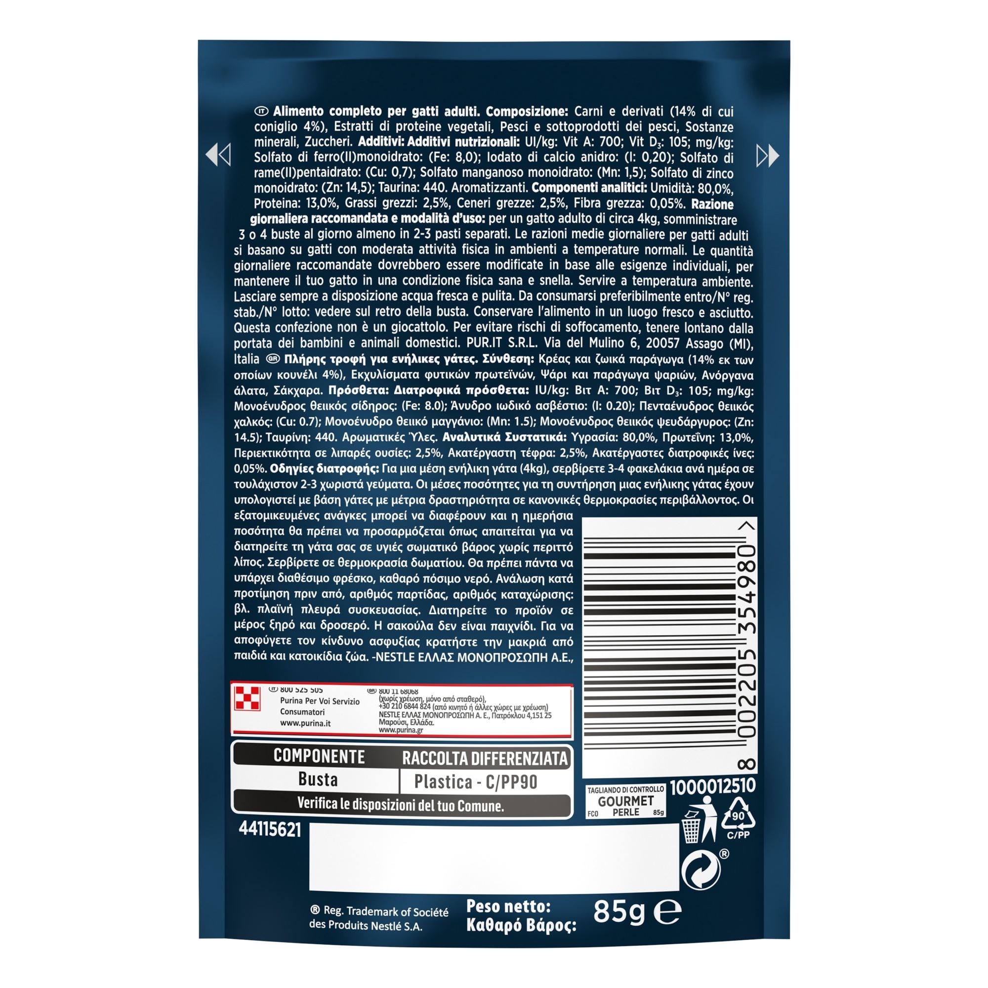 Για μια ενήλικη γάτα μέσου βάρους (4kg), προσφέρετε 4 φακελάκια την ημέρα σε 2-3 τουλάχιστον ξεχωριστά γεύματα.
